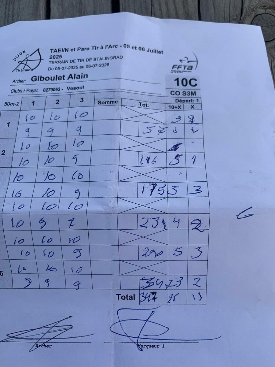 À Dijon, en concours TAEI/N, record battu avec un beau 350 points en 1ère série et 347 sur la 2ème série, il termine sa compétition avec 697 points, pour Alain Giboulet, Archer de la 1ere Cie de Vesoul.