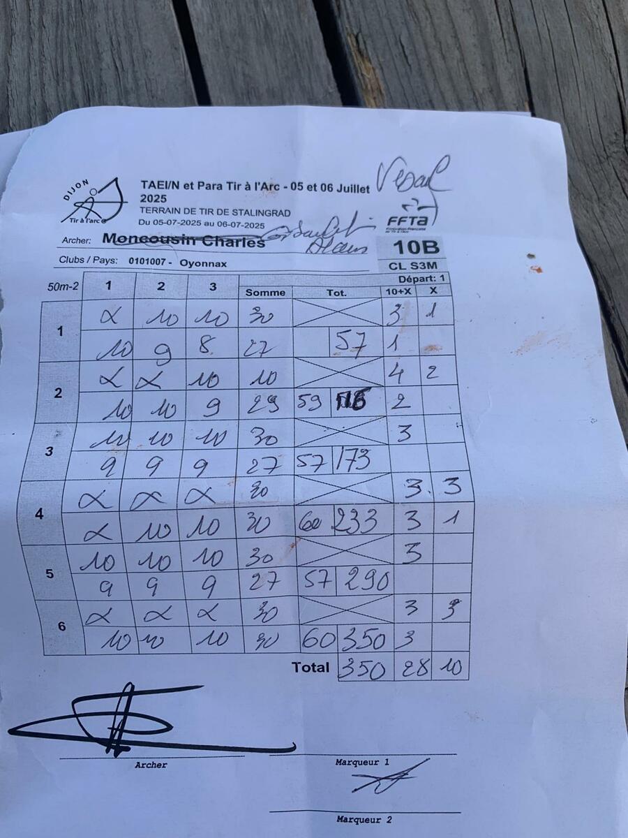 À Dijon, en concours TAEI/N, record battu avec un beau 350 points en 1ère série et 347 sur la 2ème série, il termine sa compétition avec 697 points, pour Alain Giboulet, Archer de la 1ere Cie de Vesoul.